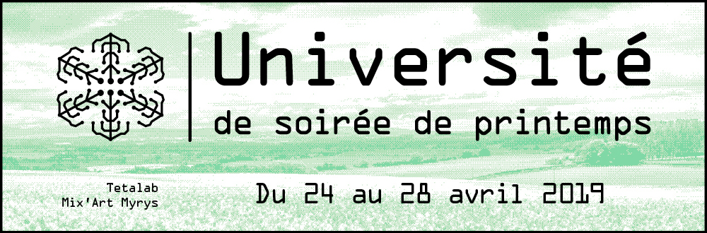 Seconde itération du cycle 2019 des universités libres du Tetalab, l'université de soirée de Printemps se déroulera du 24 au 28 avril 2019, à Mix'Art Myrys. Présentations, initiations, démonstrations, propositions de qui désire parler de ce qu'il connait, de ce qu'il pratique.