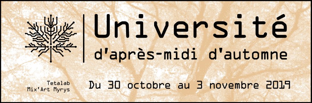 Quatrième et dernière itération du cycle 2019, l'université d'après-midi d'automne aura lieu du mercredi 30 octobre au dimanche 3 novembre 2019. Le Tetalab et Mixart-Myrys vous proposent une nouvelle rencontre studieuse à la croisée des arts, des techniques et du DIY.